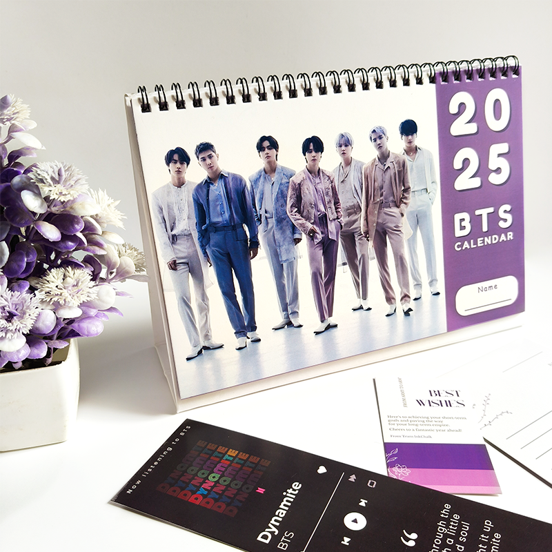 Introducing InkChalk's BTS Themed Gift Box - this collection is more than just memorabilia; it's a tribute to the profound impact BTS has had on hearts around the globe. At its emotional core is the BTS Themed Calendar for 2025, a vessel that will carry you through the year, reminding you of the beautiful moments shared with these musical maestros. This 9.5 x 6.5-inch calendar is the perfect companion for ARMYs who want to stay organized while enjoying the inspiration of their favorite group. Each month features: - Stunning BTS Photos capturing memorable moments. - Motivational Quotes from BTS members to uplift your day. Crafted with Premium 350 GSM Paper, this calendar combines durability and elegance for a premium feel. Bonus Elements Included: 1 x BTS-Themed Sticker Sheet - Personalize your calendar or belongings. 2 x Daily Activities Sticker Sheets - Make planning fun and engaging. 1 x Message/Greeting Card - Share your love for BTS with someone special. 1 x BTS-Themed Bookmark - Keep your place in books or journals. 1 x Thank You Gift Tag - A special token of appreciation from InkChalk. The ultimate gift for any BTS fan, this calendar is a perfect way to stay inspired and organized throughout 2025!